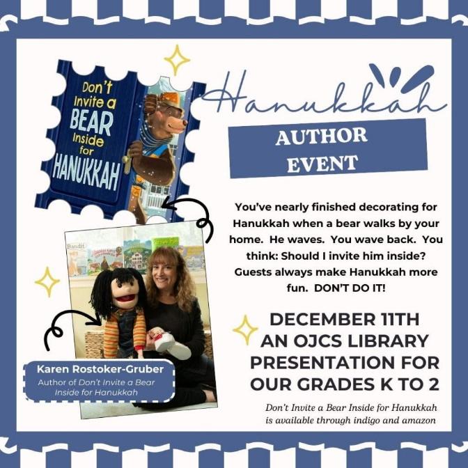 BRIGITTE RUEL, librarian at the OJCS (Ottawa Jewish Community School), welcomed author Karen Rostoker-Gruber on December 11th. Karen read her beautiful book, Don’t Invite a Bear Inside for Hanukkah, to the Kindergarten–Grade 2 students and shared her journey of becoming an author. The students really enjoyed her presentation and hope to welcome her back again in the future.